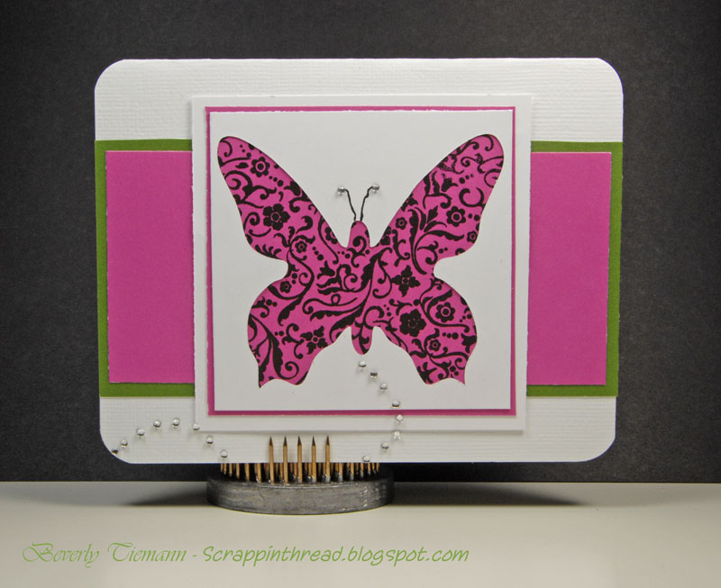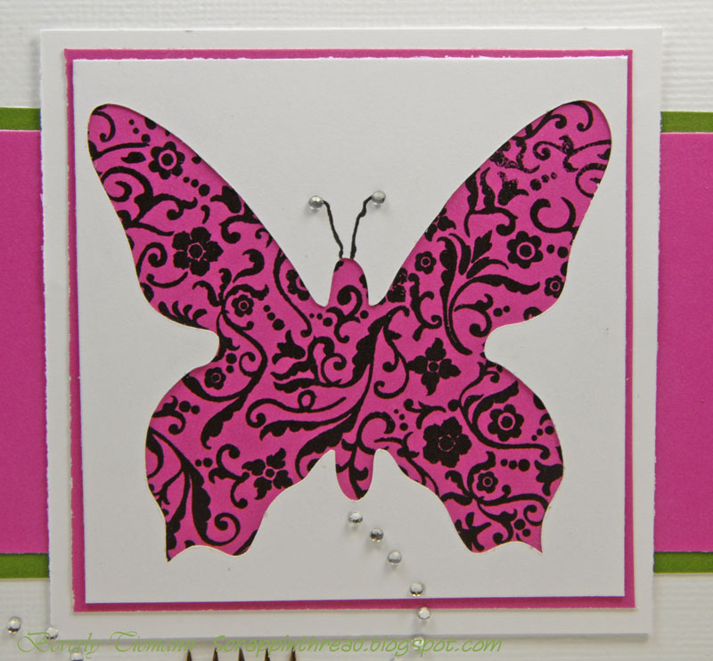 Sometimes it is hard to throw away the scraps from cut images. This butterfly was one such cut for me. It is about 3 inches tall and I knew it would look great with the Watermelon cardstock behind it. After looking at it for a couple of minutes I decided to stamp it with one of the Diverse Background stamps using CTMH’s Archival black ink. I layered it with Topiary and White Daisy cardstock along with a little more Watermelon. The final touches were the hand drawn antennae and a bit of bling.