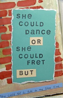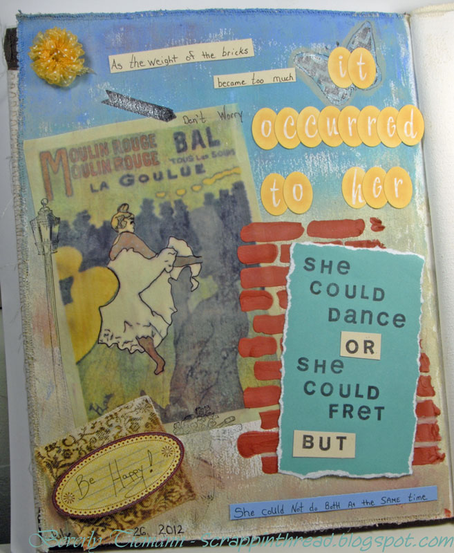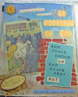 About two months ago I printed the Henri de Toulouse-Lautrec Moulin Rouge poster (from a “Permission Free” Dover CD) knowing that it was for a page in my journal. It has been moved all around on my desk until I could finally find time to use it. I also knew that I had been wanting to try mixing dye based re-inker with modeling paste. The bricks were made with CTMH Barn Red re-inker and Liquitex Modeling Paste and a Crafter’s Workshop template. It was awesome that so many things were falling into place!