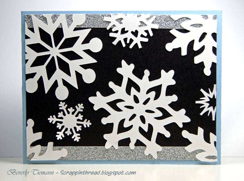 This card uses some leftover snowflakes cut using the Cricut, and one Martha Stewart punch.  They are adhered to a piece of black cardstock which has two strips of the new adhesive-backed, CTMH Silver Shimmer Trim running on the top and bottom.  This piece is on top of a Sky card base cut to the standard size, but it opens on the right hand side.