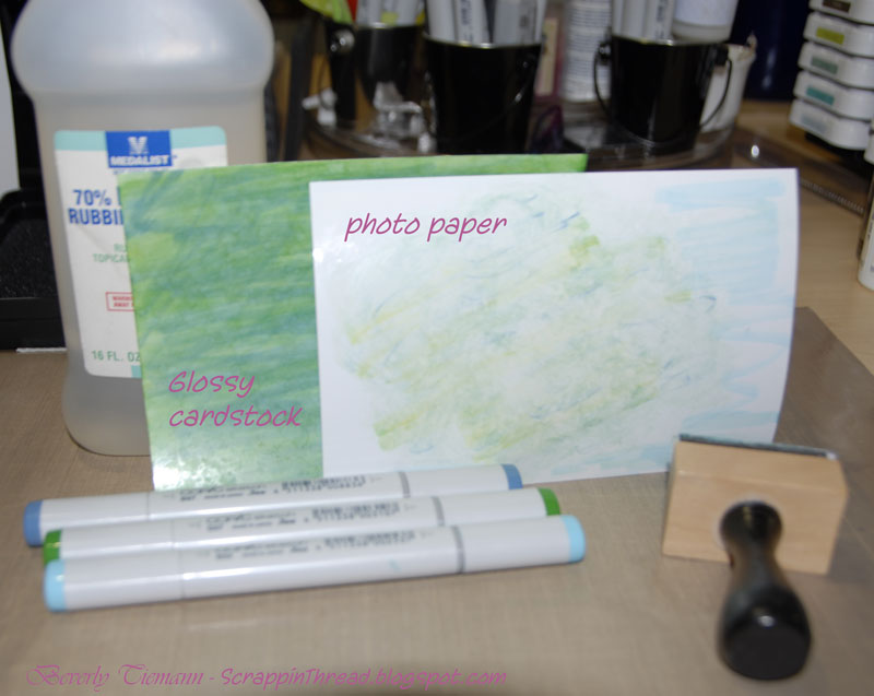 The basic method of the Polished Stone Technique is to apply ink to a glossy surface along with an alcohol blending solution. A metallic mixative is optional. Today I used 3 copic colors and regular drug store rubbing alcohol on top of glossy cardstock and Kodak photo paper. Prior to scribbling onto the paper, I coated it with alcohol. After applying all three markers, I took the Inkssentials Blending Tool (with felt) and applied more alcohol. It worked much better on the glossy cardstock than on the photo paper. When I get an air compressor, this will be the first technique I try. I think the results will be amazing! Probably more Polished-Stone-ish.