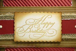 I layered the embossed sentiment over a piece of burlap ribbon and Ruby cs.  The edges of all pieces were either edge or ink distressed.