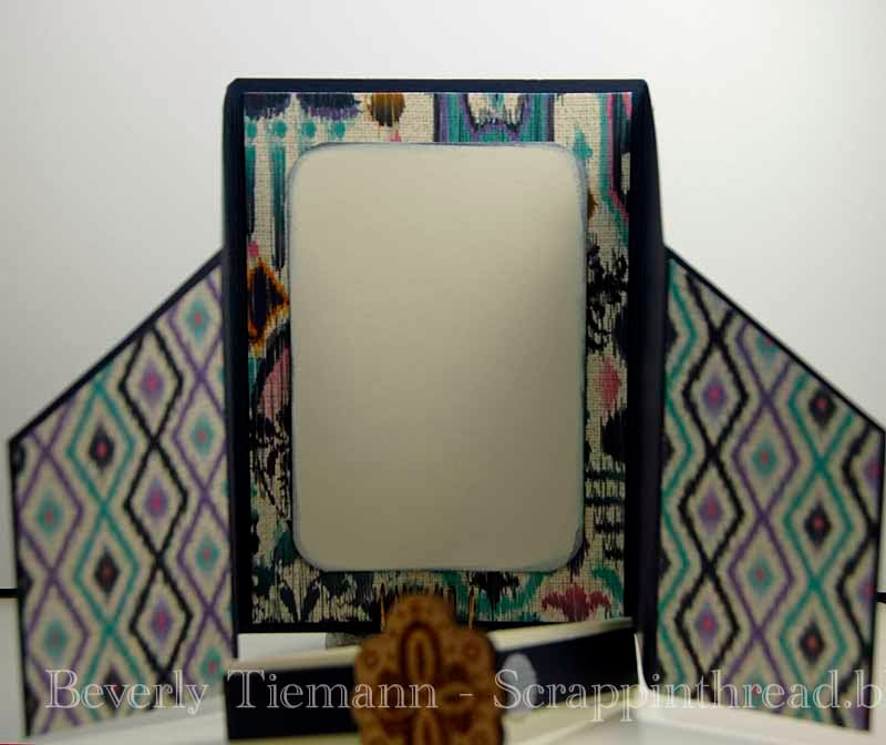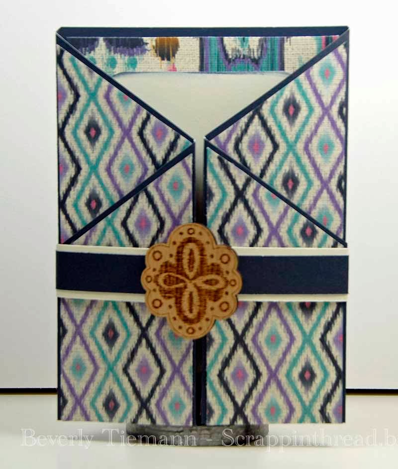 I love making cards that are a little bit different from the standard design. Gatefold cards can be made in many different sizes and with a variety of opening styles. This is a very easy card to make. The base is Outdoor Denim cardstock cut to 5 1/2″ x 12″ with Sarita patterned paper layered on top. Later this week, I’ll post a tutorial showing how to make them.
