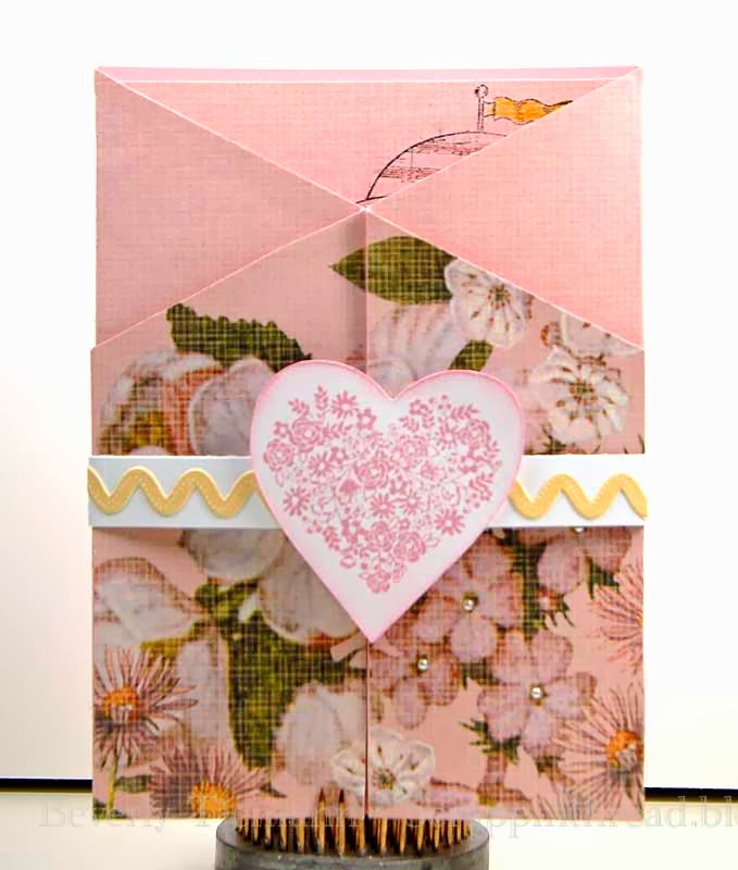 Belly bands can be slid on or closed with hook and loop tape. This one is adhered together and slides over the card to hold it closed for mailing. I like to use the decorative trim edge of the B & T paper for belly bands layered over cardstock.