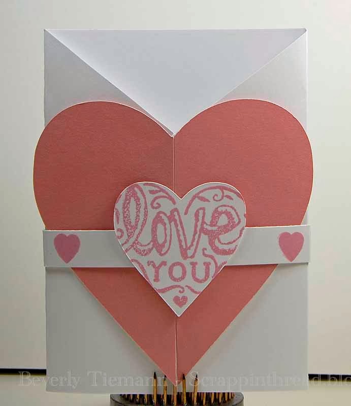 It is fun to add die cut shapes to cards. The heart below was cut with the CTMH Cricut Artiste cartridge at 4 1/4″. I then cut it in half and adhered each half on the front pieces. After affixing it to the front flaps of the card, I cut the flaps to the shape of the heart. Cupcakes, mittens, leaves and many other Artiste shapes would also work very well for a fun thematic front for the card.