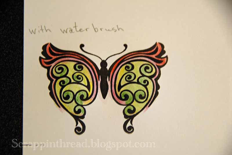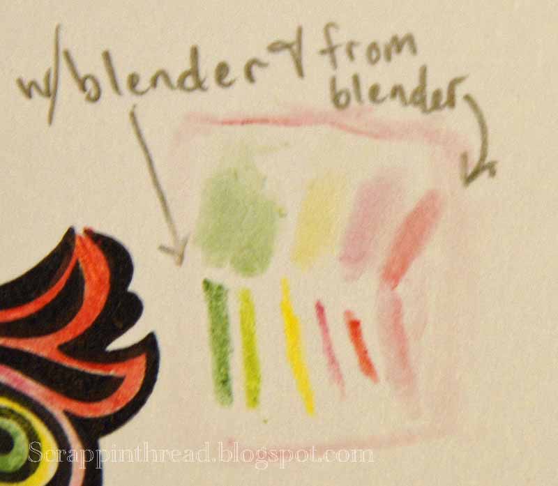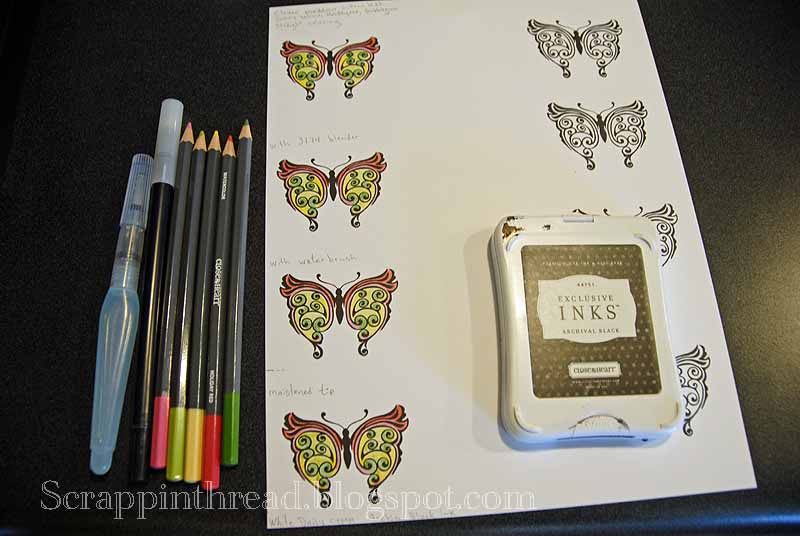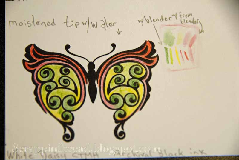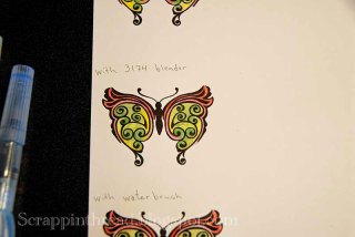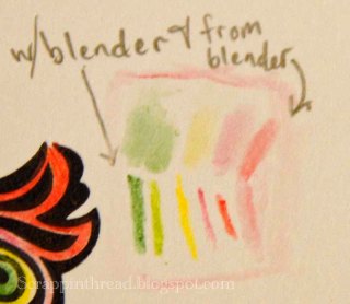 - Color lifted from the watercolor pencil tip and applied to cardstock with brush or blender