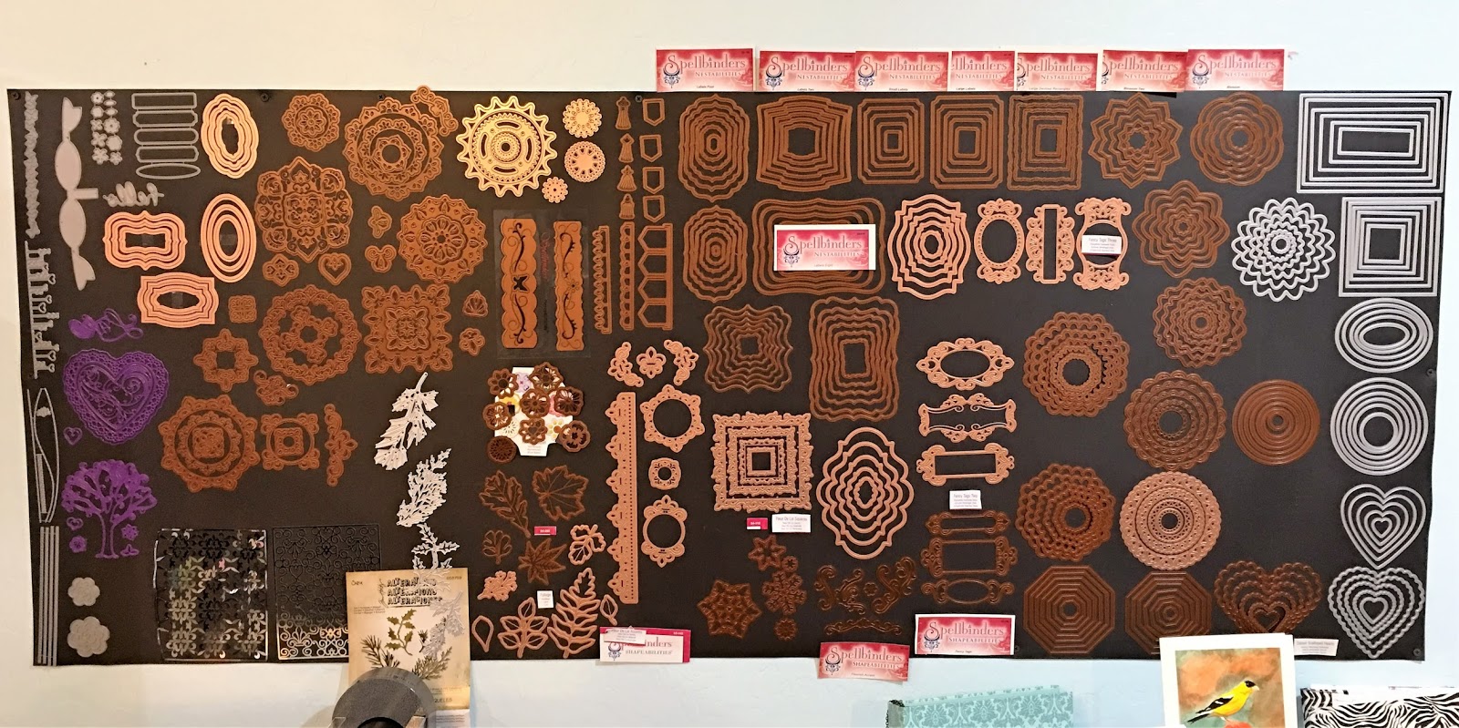 It is a 24″x 5′ long magnet for my thin dies collection. Here is the link to what I bought on  Amazon. All of the Spellbinders, Scrapbook.com, Avery Elle, etc., wafer-thin dies stick on here and are easy to see.  If I see things, I am more likely to use them. And pack them!