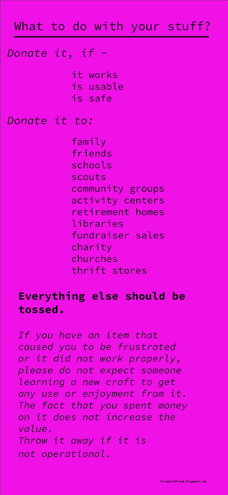 One more thing to give some serious thought to is, what is the likelihood that you are going to get to the project that uses those materials and supplies. In realistically assessing my life expectancy, I can not get everything made for which I have accumulated the supplies. It would be better for those things to be used by someone who will make them into something.