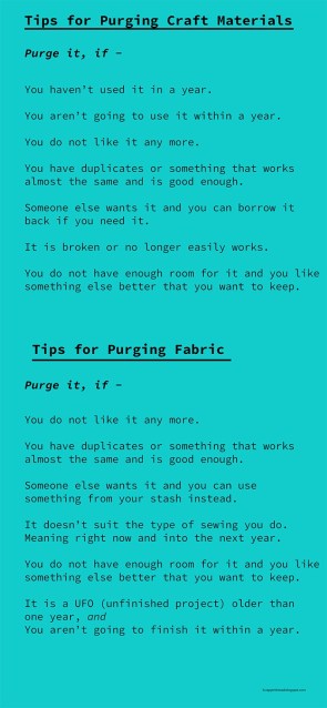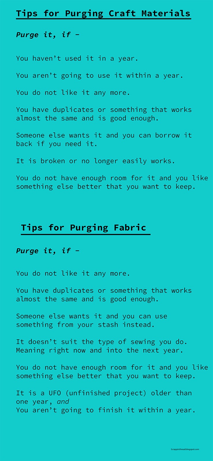 Yesterday, I posted here a little about what has been happening with me over the past year and a half or so. It sort of feels like the theme of this time period has been Purging and Starting Over. Downsizing has taught me quite a few things. To that end, here are suggestions/tips for purging your craft supplies, tools and fabric.