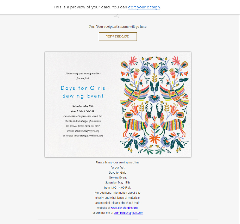 The only other difficulty I had was in locating answers to questions that I had. Surprisingly, when I tried again today, on my phone, it was really easy. I’m guessing I was just having a bad day the other day when I first went poking around on their website. I was in a big hurry because I was still sorting through all of the stuff that had been damaged in our storage unit from a leaking roof. At the time I was feeling anxious because another holiday was fast approaching and I STILL wasn’t able to create cards for it from my stash! Honestly, the option to make digital cards was not the first thing that came to mind. It is a good option, though! I am glad that Paperless Post approached me so that I can send Mother’s Day cards to both my mom and my daughter, who is celebrating her first Mother’s Day as a new mom.