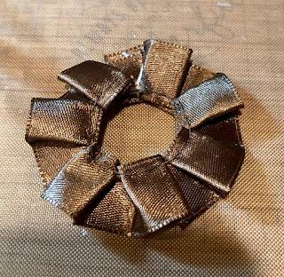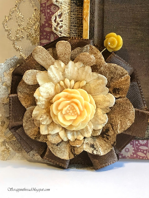 The very bottom of the flower is a paper doily which was distressed with ink and folded. Glued on top of that is a piece of ribbon formed into a hoop. More distressed paper flowers were glued on top and finished with a resin flower center.