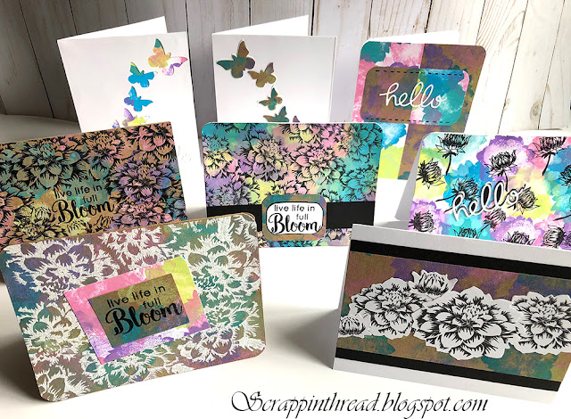 It all started when I was making swatches for some Distress Oxide inks. I was curious about using a solid stamp on kraft and white cardstock. It is fun to compare the different ways that paper takes color and water. These backgrounds were made on one 12 x12 kraft and one 8 1/2 x 11 white piece with six different colors of Distress Oxide inks. Any kind of solid stamp would work. I used one from one of the Altenew flower sets. Stamping gives a different effect than applying the ink pad directly to paper. This is a more abstract, softer look. Which in turn made pretty cards.