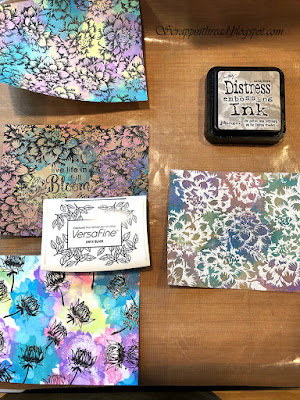 After randomly stamping the ink onto the cardstock with an Altenew solid flower stamp in the different colors, I cut them into 4 1/4-inch by 5 1/2-inch pieces. Some of the pieces were splattered with water. The others were left as is. Some were stamped and embossed with either clear detail or white embossing powder.