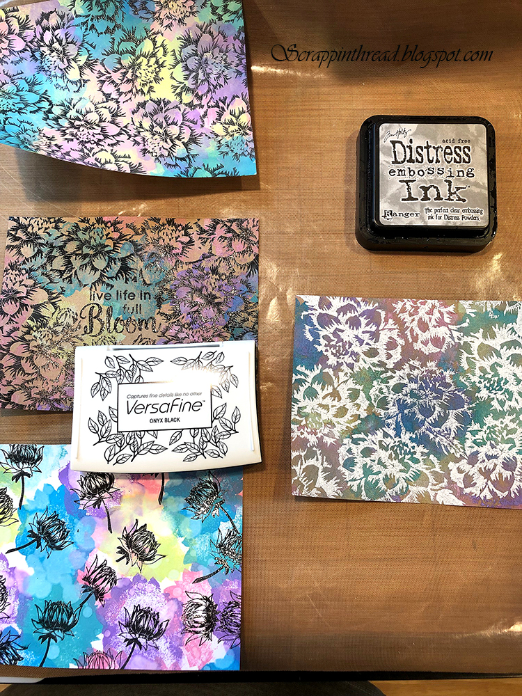 After randomly stamping the ink onto the cardstock with an Altenew solid flower stamp in the different colors, I cut them into 4 1/4-inch by 5 1/2-inch pieces. Some of the pieces were splattered with water. The others were left as is. Some were stamped and embossed with either clear detail or white embossing powder.