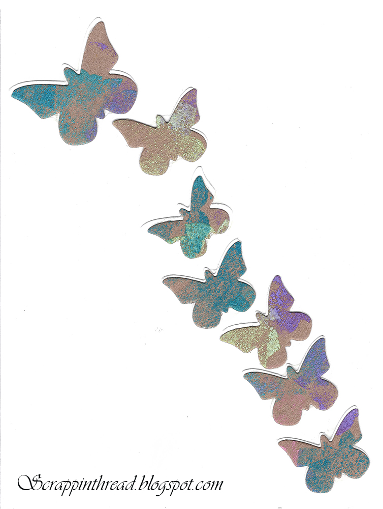 Others were cut into smaller pieces or die cut. I used the negative and positive cuts for the following two cards. The extra white butterflies were used under the kraft ones for more dimension.