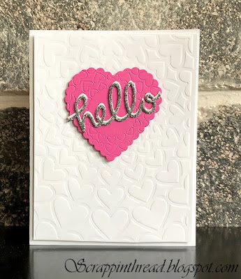 One of the things I discovered as I was playing with the new toys is that I could emboss and deboss the design for a really fun effect. This is an added bonus to the intended purpose. After embossing the pink shape, I cut a scalloped heart using Scrapbook.com’s Umbrella Crafts nested die. The “Hello” was cut twice. Once with white cardstock and once on black with a double-sided adhesive so that glitter would stick to it. The card top is popped off the base with dimensional foam tape.