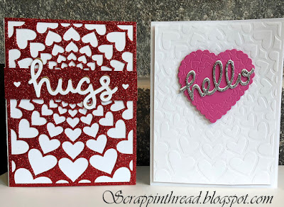 Pictured below are two cards side-by-side to illustrate the die cut versus the embossing/debossing. The “hugs” card is a super simple card to make! It is glitter paper cut with the cover die and layered on white cardstock. So pretty with almost no effort!