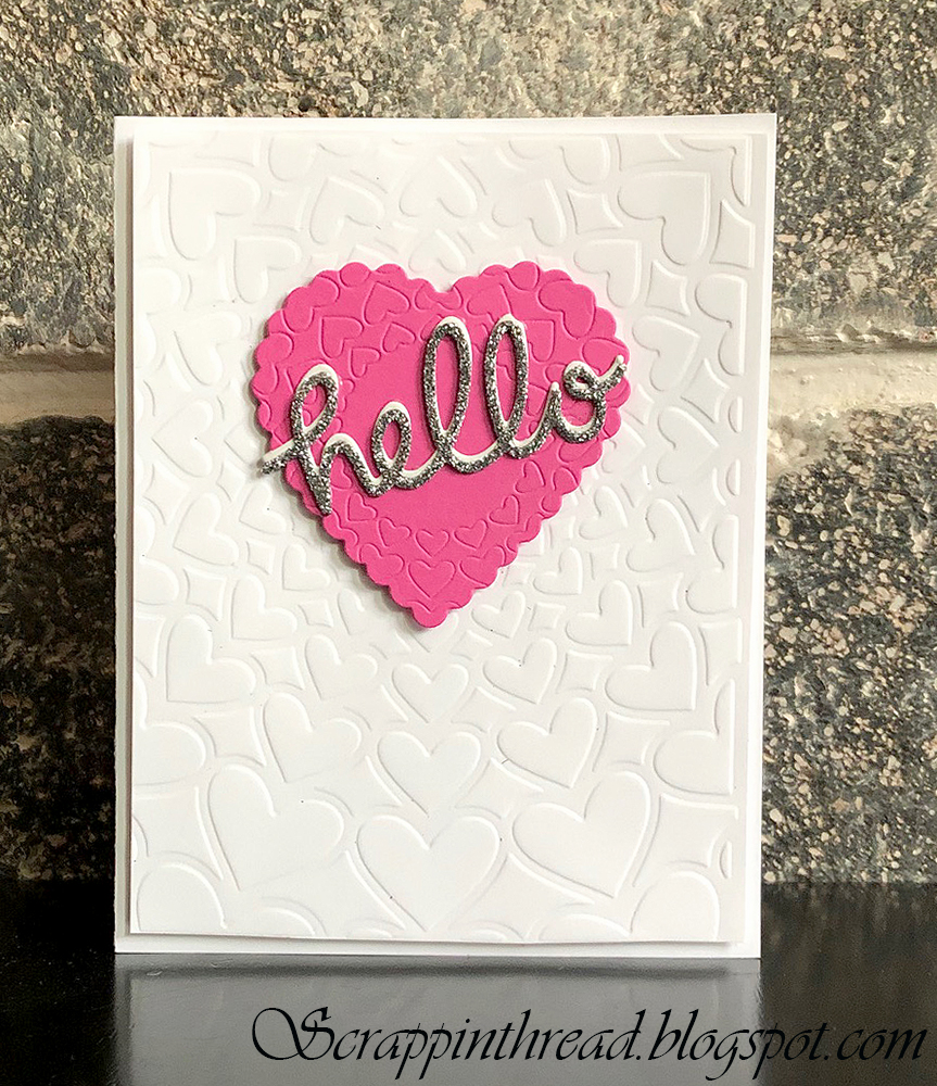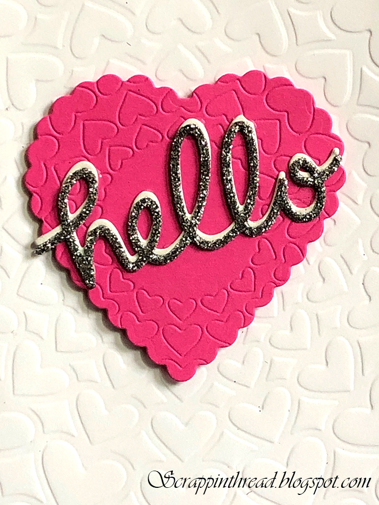 One of the things I discovered as I was playing with the new toys is that I could emboss and deboss the design for a really fun effect. This is an added bonus to the intended purpose. After embossing the pink shape, I cut a scalloped heart using Scrapbook.com’s Umbrella Crafts nested die. The “Hello” was cut twice. Once with white cardstock and once on black with a double-sided adhesive so that glitter would stick to it. The card top is popped off the base with dimensional foam tape.