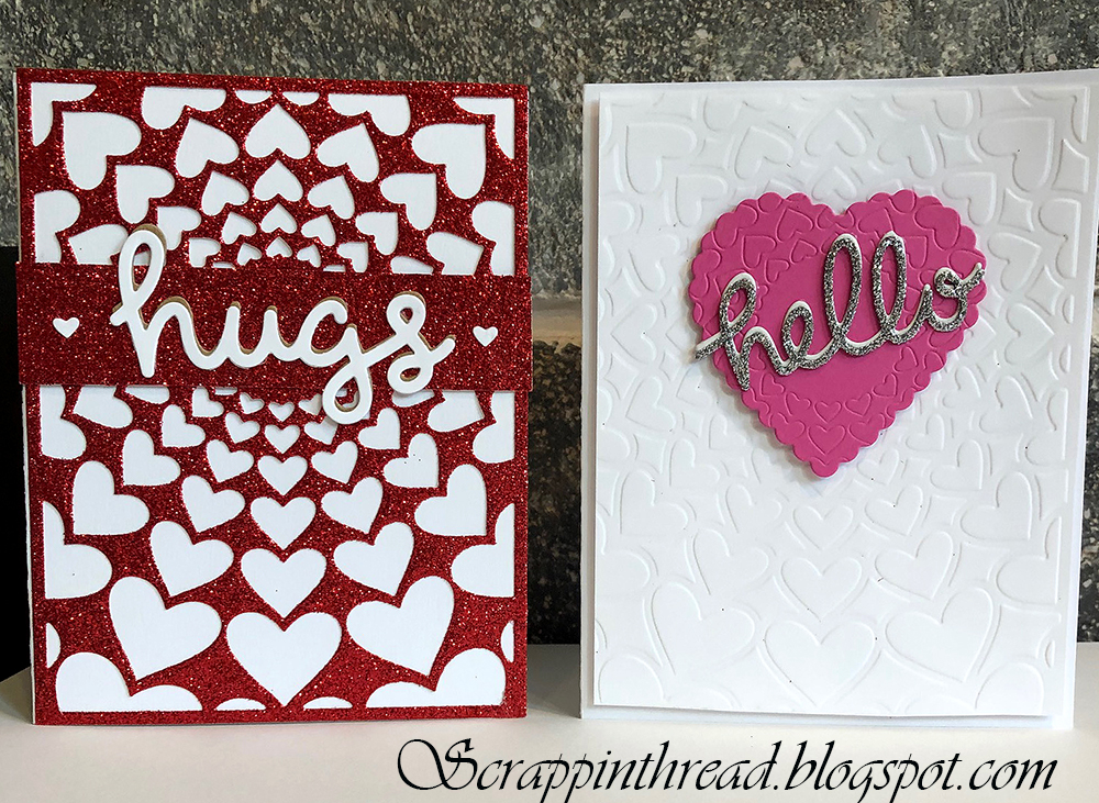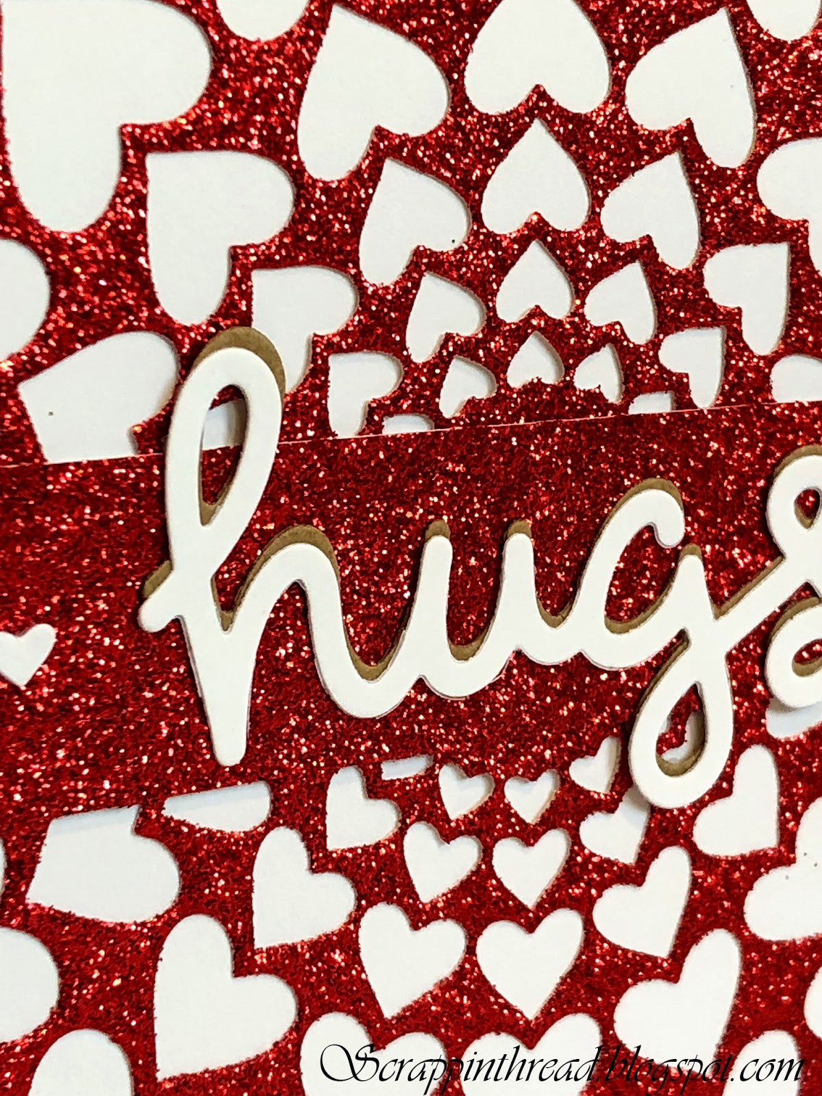 Pictured below are two cards side-by-side to illustrate the die cut versus the embossing/debossing. The “hugs” card is a super simple card to make! It is glitter paper cut with the cover die and layered on white cardstock. So pretty with almost no effort!