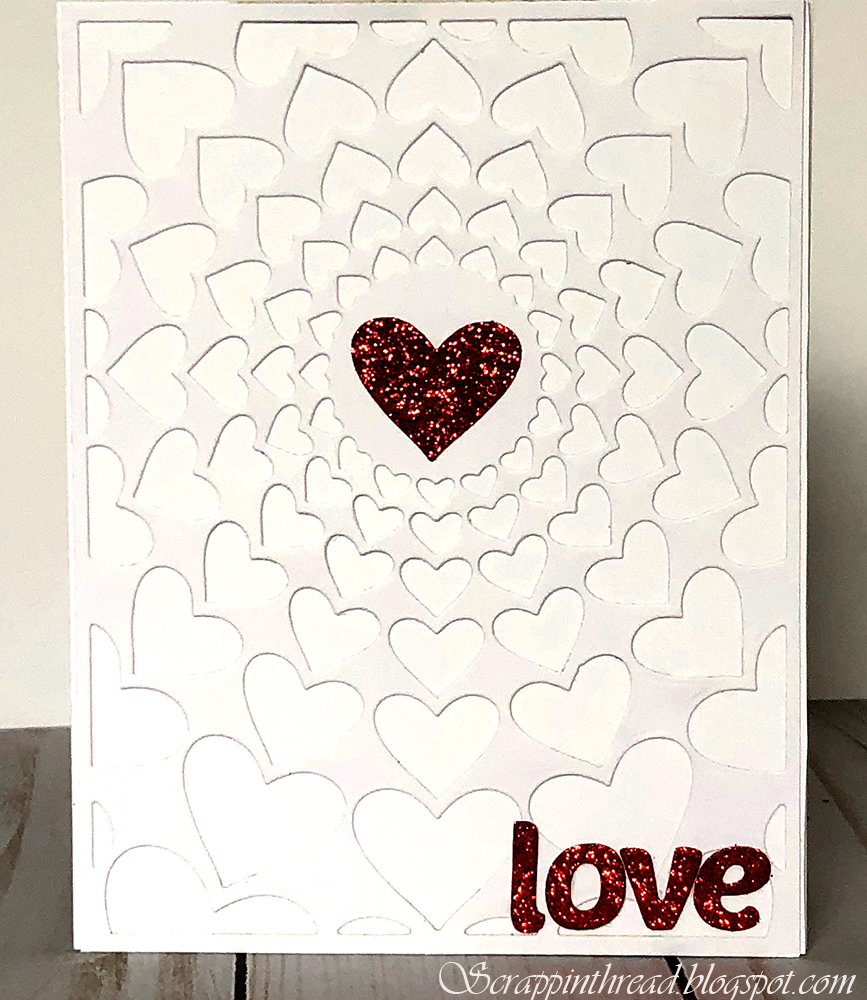 I can not help myself. There was one more blingy card leftover on my phone that should have gone in yesterday’s post. So here it is, in case anyone wants to see another mailable, very easy-to-make card. To finish off the Radial Hearts theme, later this week I hope to have a scrapbook page and video showing how to do the glitter part of yesterday’s cards. Supplies that are currently available are posted below. The rest came from my stash. Thank you for visiting!