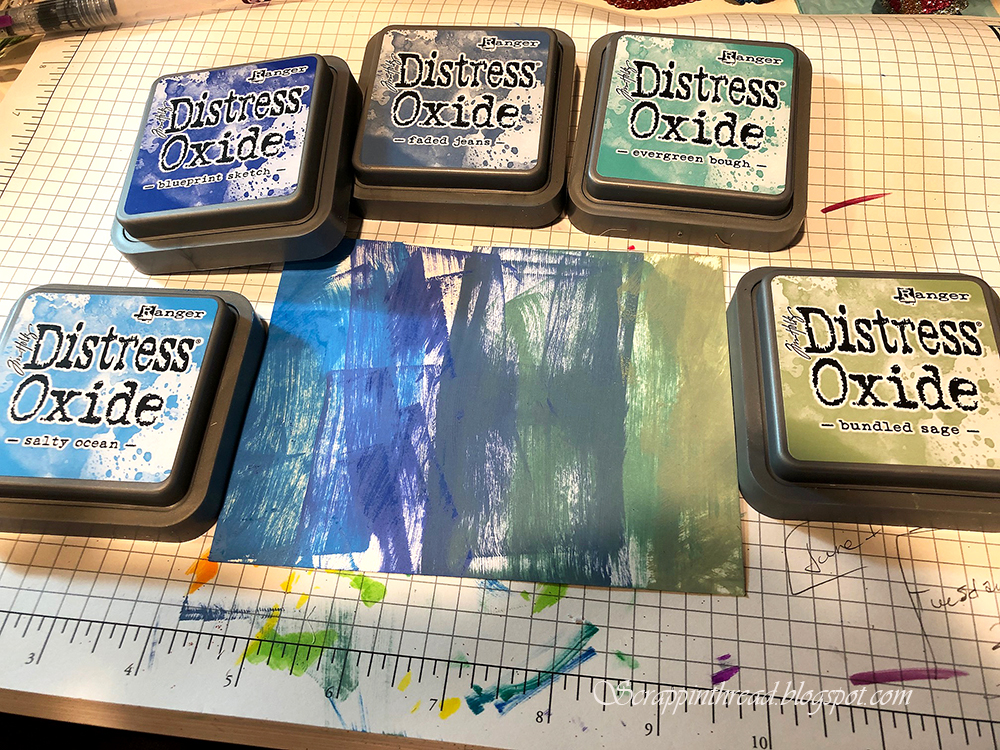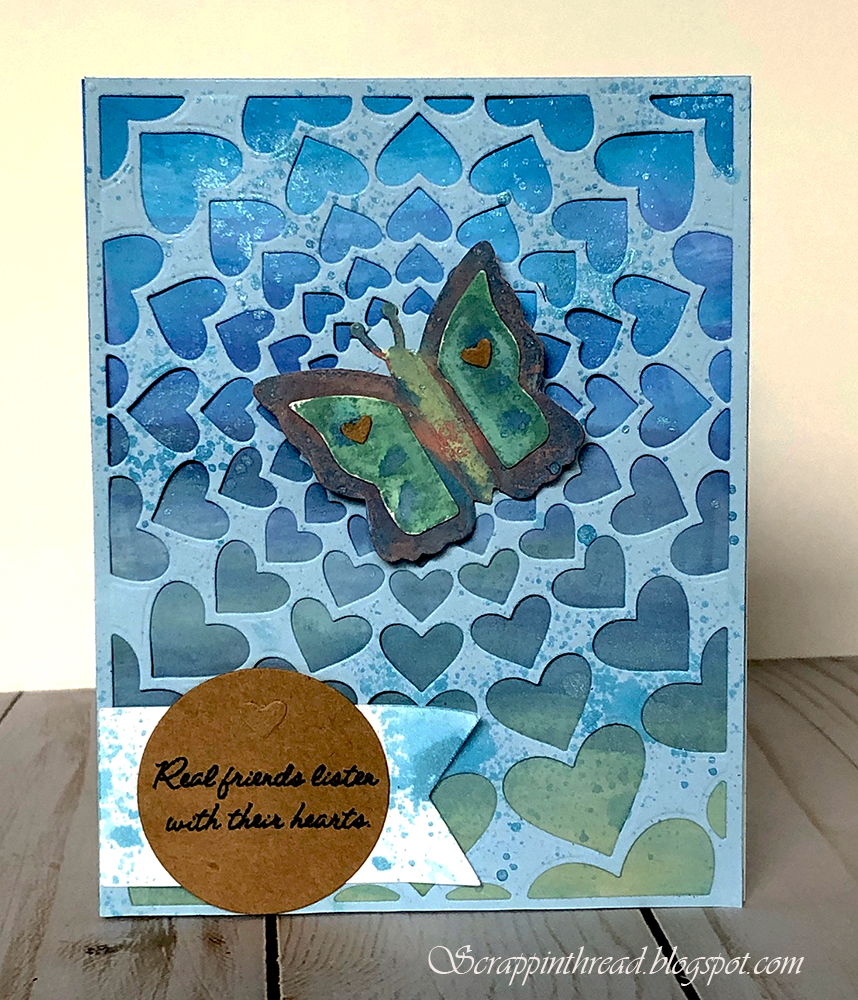 The next card was watercolor/grunge inspired. I applied five colors of Distress Oxide onto white cardstock and then wet it. The Radial Hearts die cut image, a butterfly, and sentiment are layered on top. This was easy and fun to make.