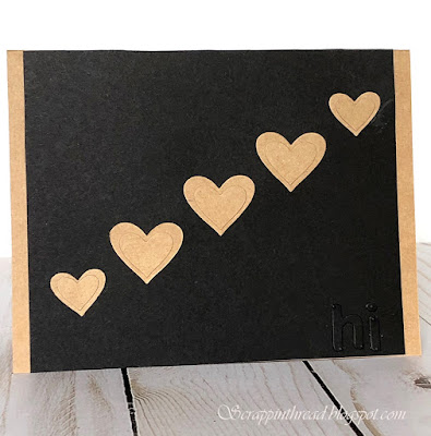 These were all very easy and quick to make. The hearts from the first card were stacked and glued onto the second card. In the lower right-hand corner the word “hi” is barely noticeable. Subtle and simple is what this card is about.