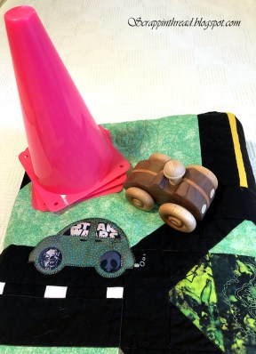 Last summer, I bought an adorable handmade wood car for my newborn granddaughter at an art fair. I’ve had nearly a year to plan a quilted playmat for her. It is embarrassing to say that I didn’t actually start it until last week. In my defense, my sewing machine and most of my other crafty stuff have been inaccessible up until very recently. So here it finally is, in time for her first birthday! A playmat quilt for Amelia’s car:
