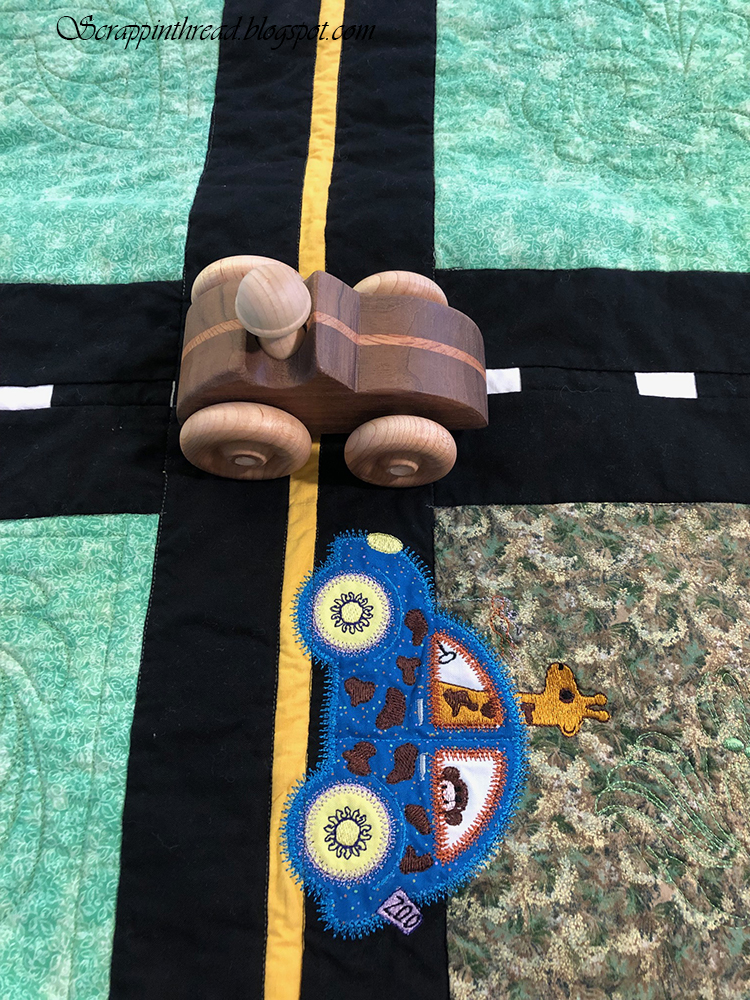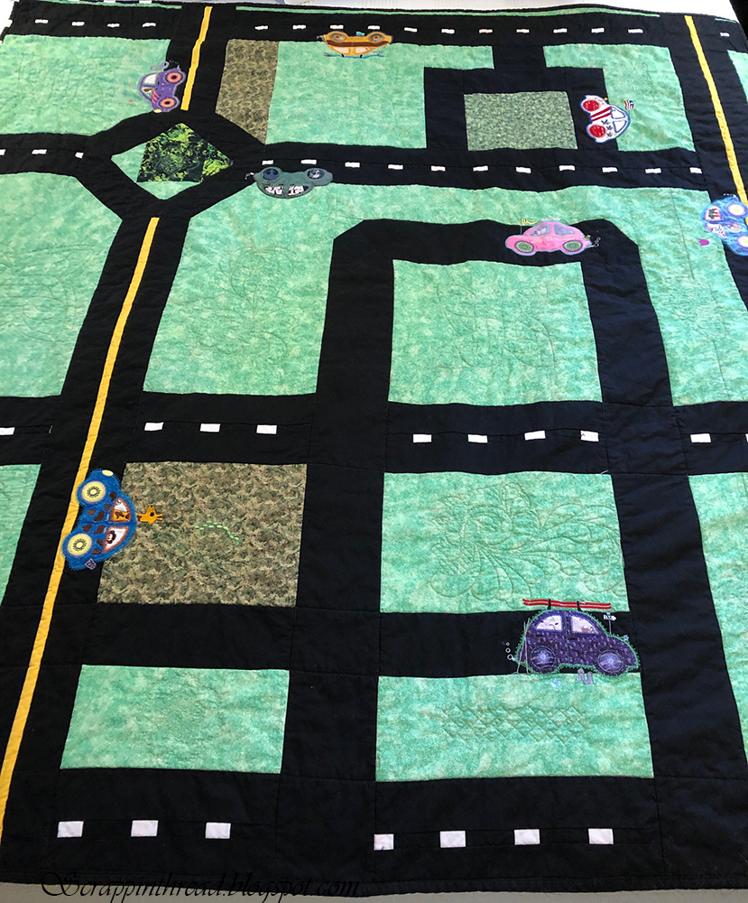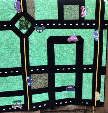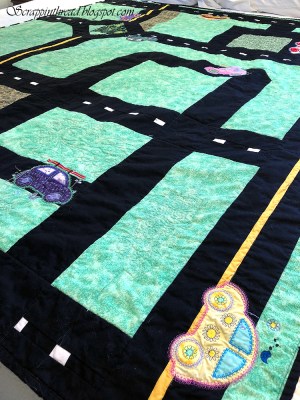 There are more digitized designs available that are not on the quilt. I bought nine of the embroidery designs and added one extra Star Wars themed car made from scraps leftover from another project.