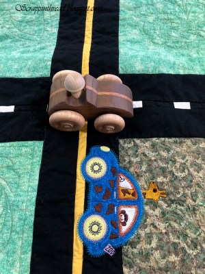 Last summer, I bought an adorable handmade wood car for my newborn granddaughter at an art fair. I’ve had nearly a year to plan a quilted playmat for her. It is embarrassing to say that I didn’t actually start it until last week. In my defense, my sewing machine and most of my other crafty stuff have been inaccessible up until very recently. So here it finally is, in time for her first birthday! A playmat quilt for Amelia’s car: