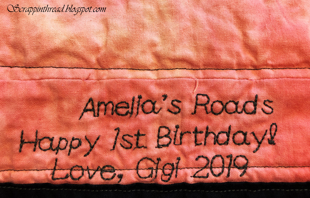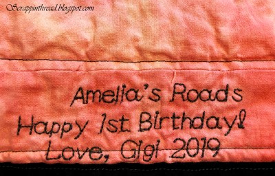 In lieu of attaching a quilt label, I sewed directly onto the backing fabric. This was very easy using the built-in alphabet stitches on my sewing machine.