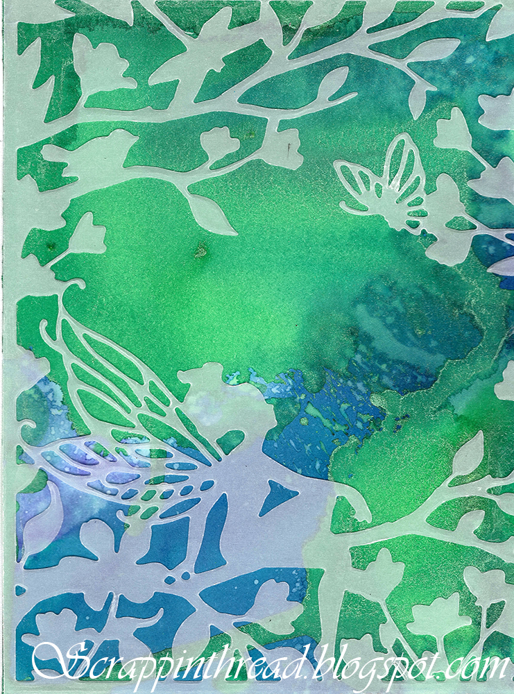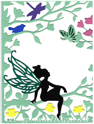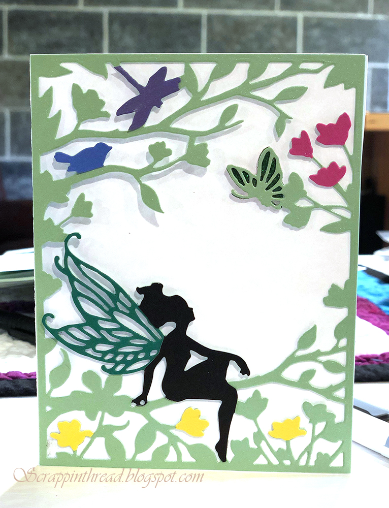 The fairy picture, above, does not have anything to do with paper piecing. But, I wanted to show another way to get a variety of colors using one die cut image.  The base under the vellum piece was made using two different kinds of powder paint on Bristol paper, spritzed with water.  The green is a shimmery Tonic product and the other colors are Ken Oliver’s Color Burst.