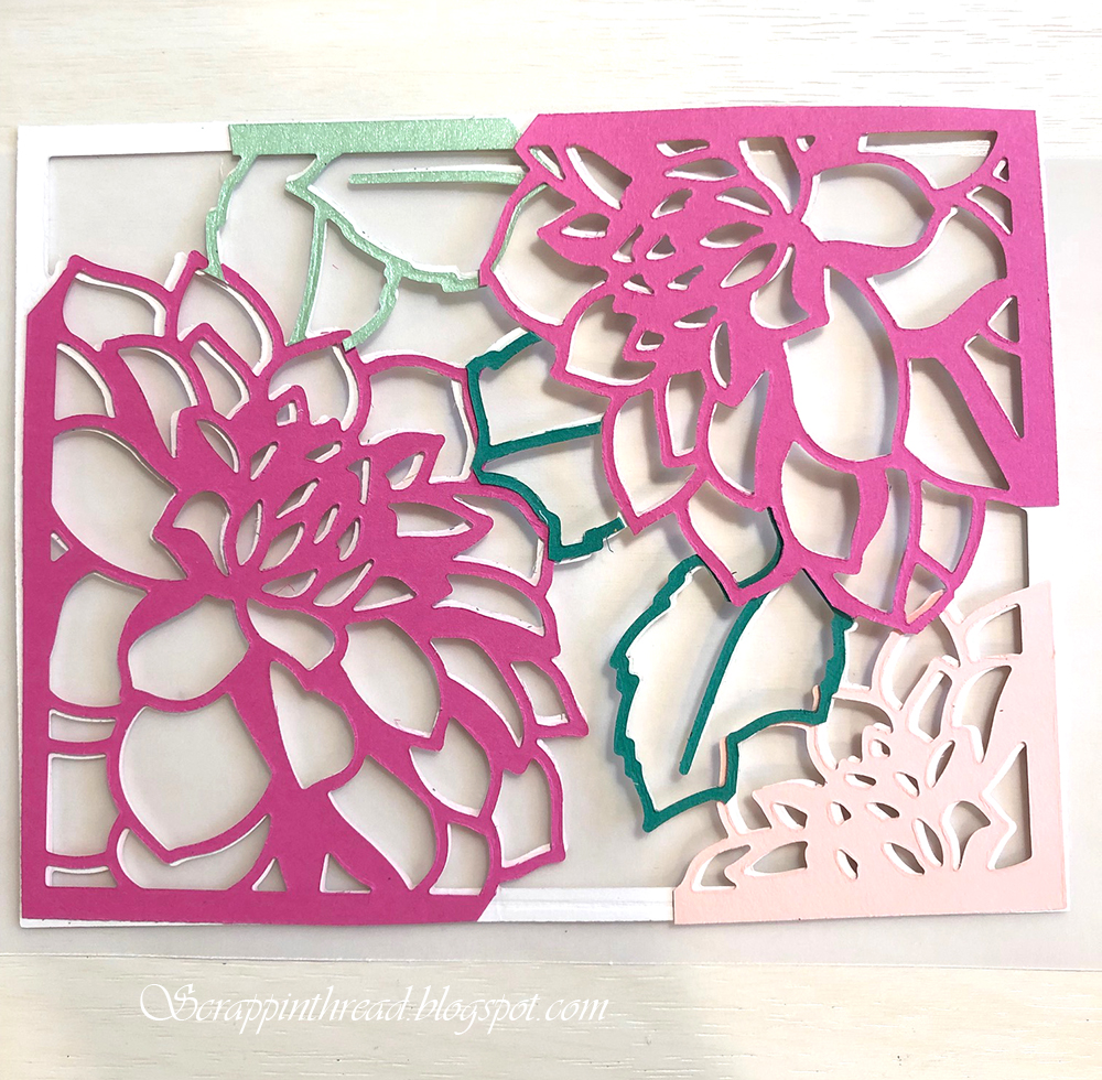 This next card die is from Altenew. The picture below shows the backside of the die-cut image with the different colors of pieces adhered to the back. The front is layered on a piece of vellum which is adhered to a standard white card.