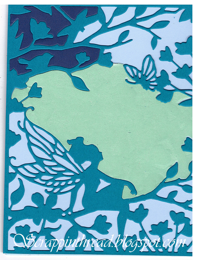 If you want to replace the background with different colors of paper, you would cut out the entire image.  Piece the colors of the negative spaces back in and adhere to a card front.  The picture above shows just two different pieced colors.  The light blue is the card base. This is not a completed card, it is an example of how to use the negative cuts.
