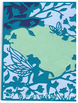 If you want to replace the background with different colors of paper, you would cut out the entire image. Piece the colors of the negative spaces back in and adhere to a card front. The picture above shows just two different pieced colors. The light blue is the card base. This is not a completed card, it is an example of how to use the negative cuts.