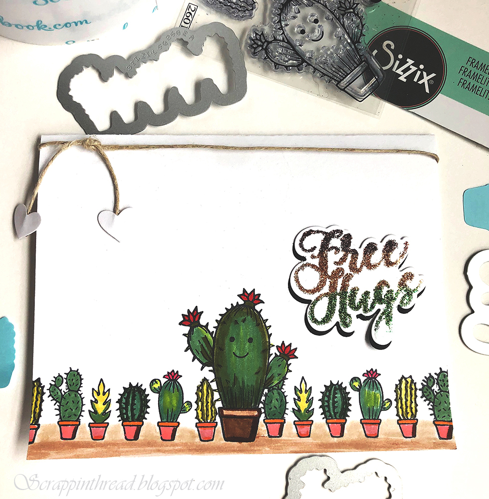You know those moments when you see something that you just need to have because it strikes you that it is perfect for you or someone you know? Well, this stamp and die set fit that situation for me. It is a really cute set and is easy to color. I dusted off the Tombows after I masked the cacti and hoped they hadn’t dried out in the almost two years of neglect in storage. The glittery die cut piece was stamped with a glue stamp pad. Then I poured three different colors of glitter on it and matted it onto the card front. The two little cutout hearts glued to twine seemed like a rustic, yet sweet, touch. This is a mailable, standard-sized card at 4.25″ x 5.5″.