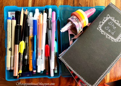 Below is a picture of my little travel kit that I took with me when I started two of the quote booklet/inserts a few weeks ago when I flew to Tucson. This one is all black paper and has quotes by women. I love how easy it was to work on the airplane with my little booklets!