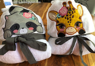 Both of the towels are made with a bath and a hand towel, each. The designs are machine embroidered applique on the hand towel. After the design is done sewing out then the hand towel is sewn to the bath towel. It is a very simple and useful project.