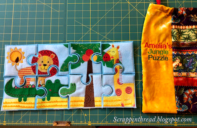 The following designs are from Scissortail Stitches, which is an offshoot of OESD. The puzzle is done completely in the hoop. I used some scraps to make a little bag to store the eight pieces of the puzzle.