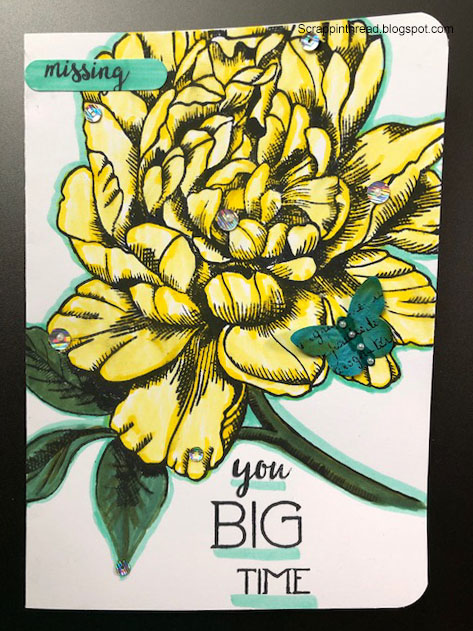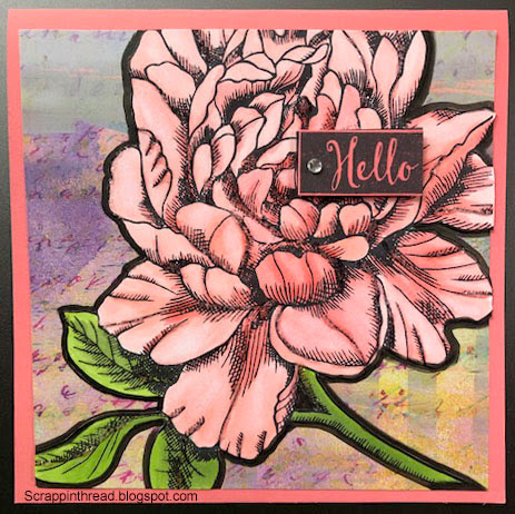 The art journal page on the right-hand side has the peony stamped on it several times. Both projects used Tuxedo Black Memento ink.