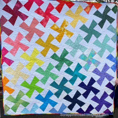 If this quilt looks familiar, that is because it is the second one I made using a rainbow colorway. I posted about the original (here) and another, scrappy one using the same die last summer. Those two were made for charity. The one above, my teen-aged daughter claimed.