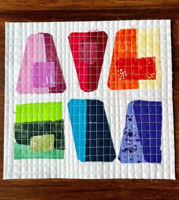 This past February, the Portland Modern Quilt Guild hosted Tricia Royal. I was fortunate enough to get a spot in her virtual class and learned new ways of using up small pieces of fabric. She introduced me to another way to just sew without too much pre-planning. I loved the class and was very inspired by her work. We made two small pieces. I combined them because I loved the busyness of one of them and the open, negative space of the other.