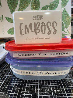 The picture below shows the stencil leaves after embossing with Verdigris embossing powder and then again with Copper embossing powder.