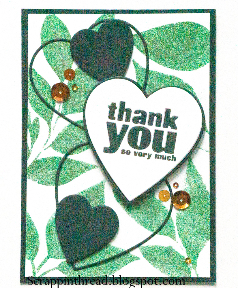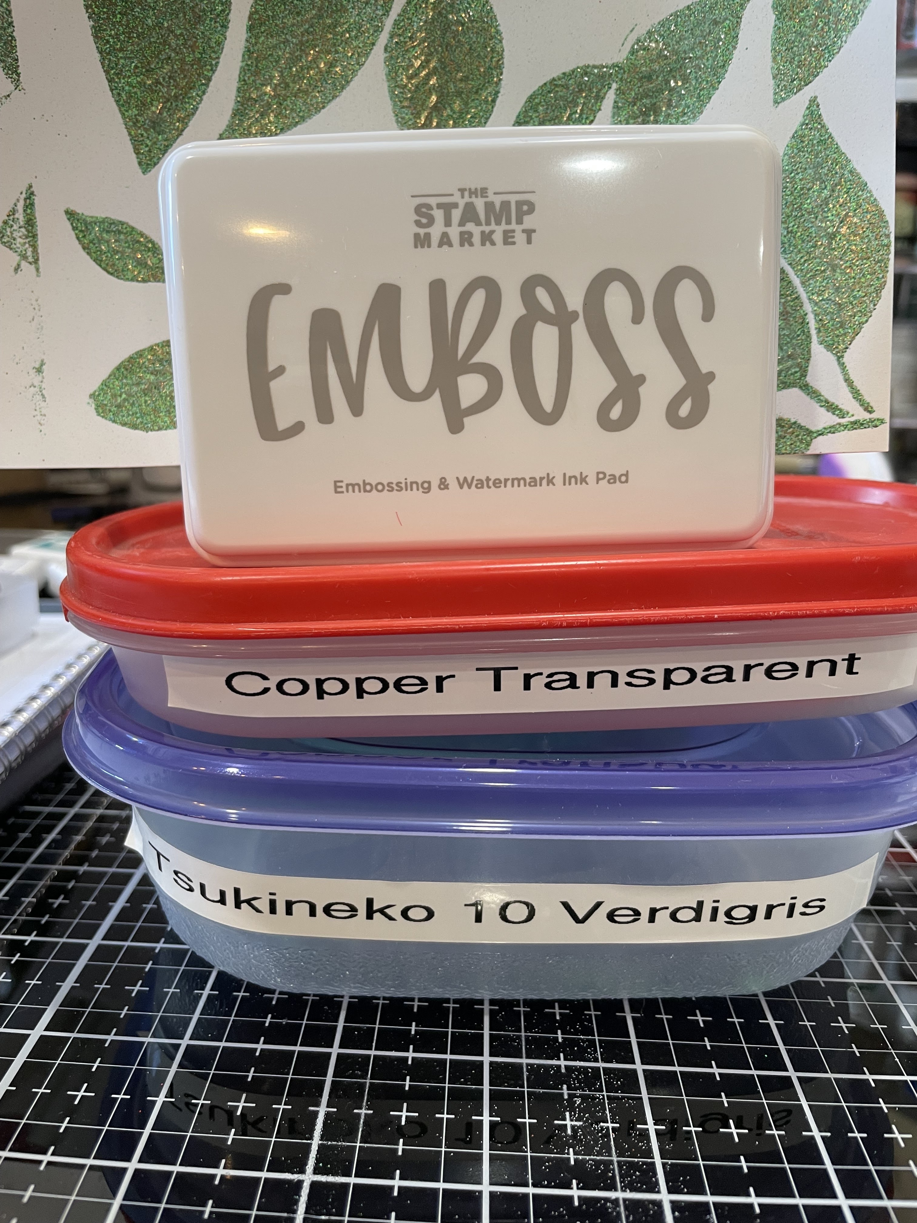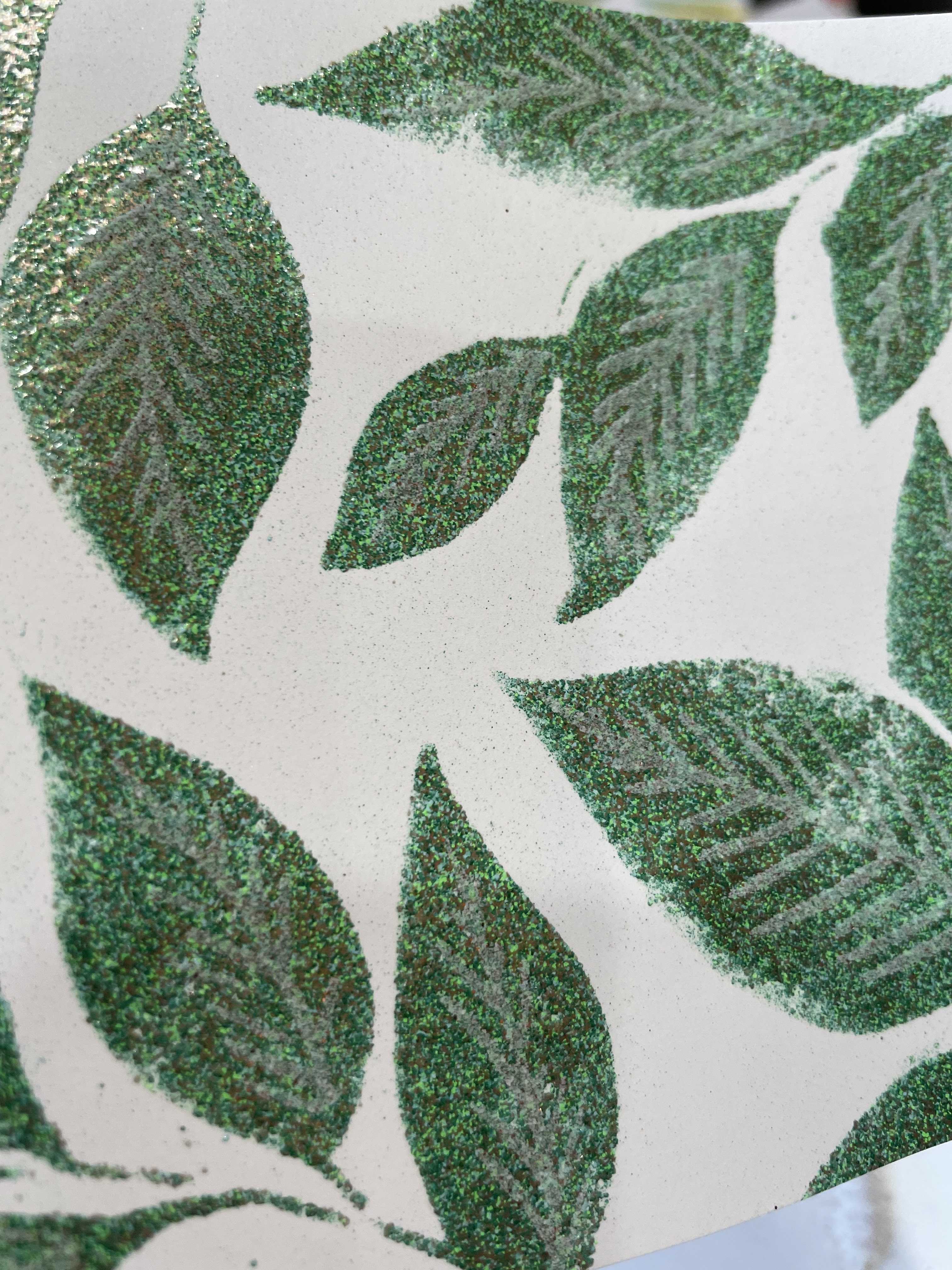 The picture below shows the stencil leaves after embossing with Verdigris embossing powder and then again with Copper embossing powder.