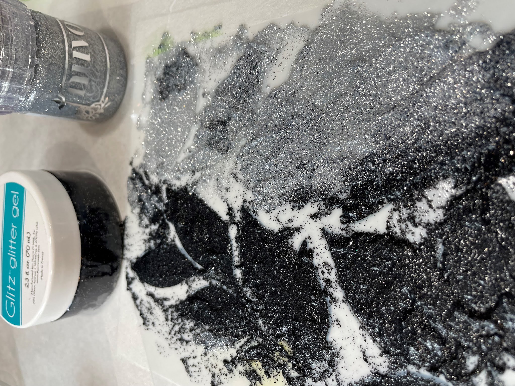 This photo shows both products during the plop and smooth stage. This particular stencil is from The Stamp Market. However, in the video I also used stencils from PinkFresh Studio, Lawn Fawn, and The Crafter’s Workshop. Pictured below is the Glitz and Glitter immediately after lifting the stencil off the freezer paper.
