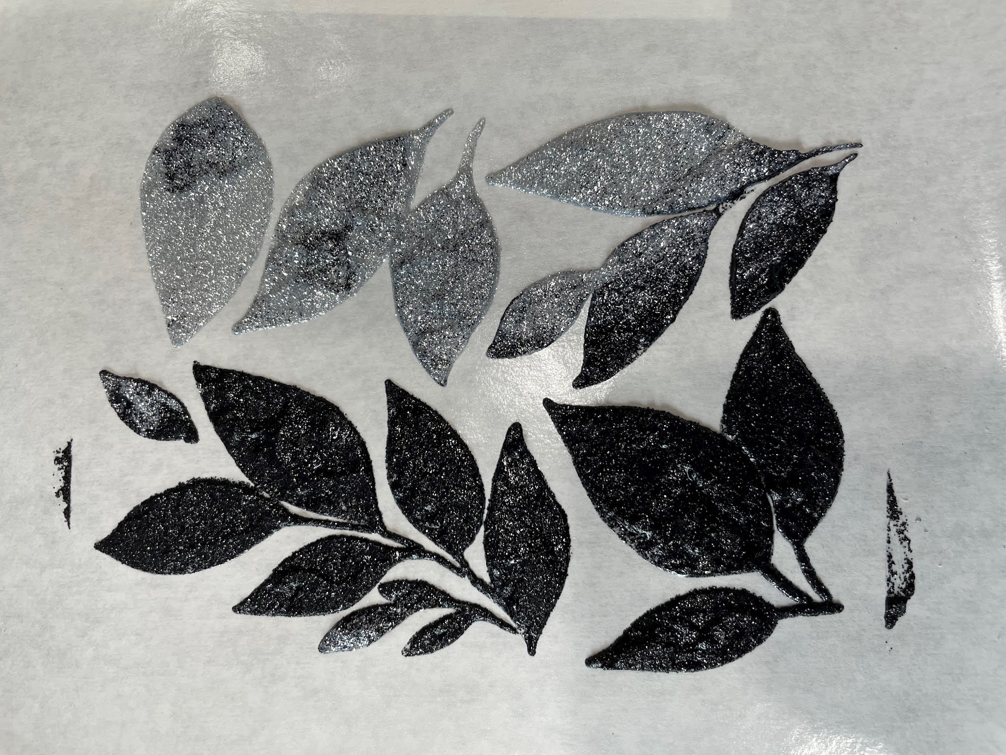The products need to dry or cure for at least 24 hours. The stenciled image should be easy to pull off the freezer paper if thick enough and given enough time to dry. If it seems that the embellishment is too fragile to peel off try cutting around the shape with sharp scissors. The paper will not be visible if you cut very close to the edge of the shape. At the bottom of this post, you will find a picture of a card that I made using the black leaves shown above. When choosing a stencil, you want one that has a lot of open space. One that reads as a solid design.