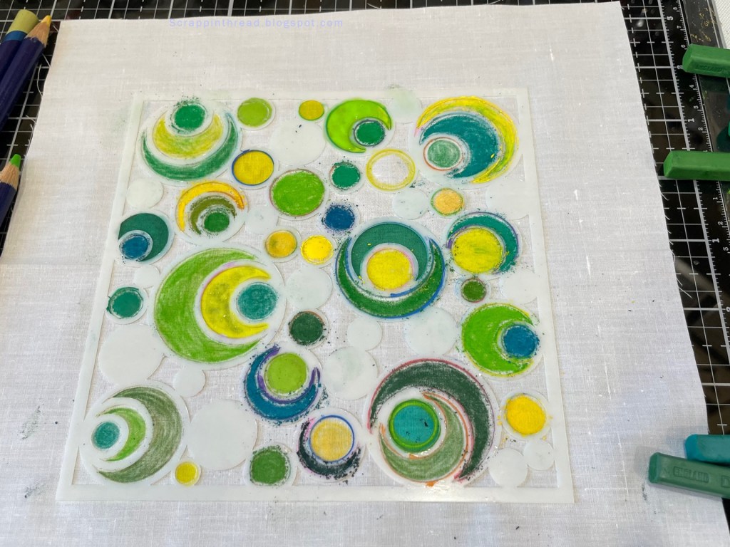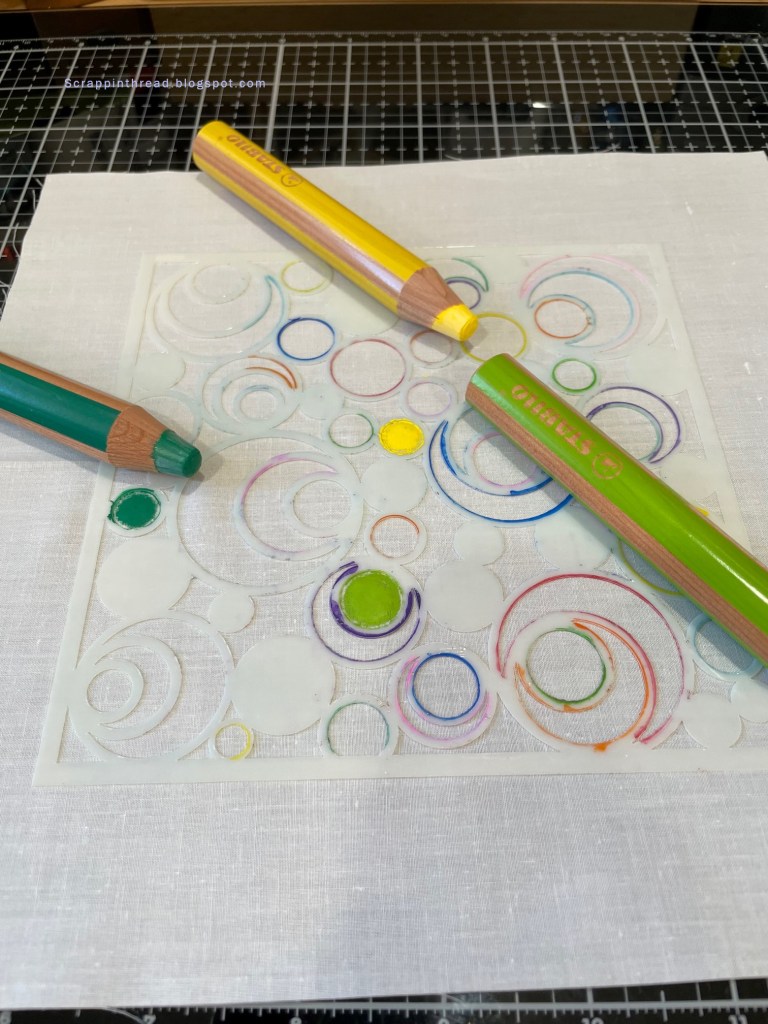 The first step was to see how a variety of media would work with this stencil on a piece of PFD Kona cotton. The Stabilo chunky pencils and the Derwent Inktense pencils worked as expected with no bleeding. Once the Inktense pencils and Inktense blocks were activated with GAC 100 the color did move. The Crayola Fabric, Marvy, Sharpie Stained, and Jacquard Tee Juice markers bled slightly but were easy to control. The Dye-na Flow is more challenging to control. I use water brushes filled with the dye and this can saturate the fabric quickly.