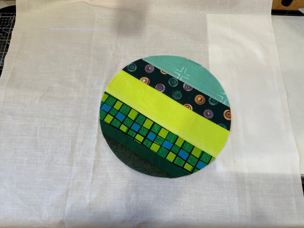 I got a little carried away with adding circles and the finished quilt was too busy for my liking. It measures about 16 x 17 inches. The picture above shows it on my design wall.