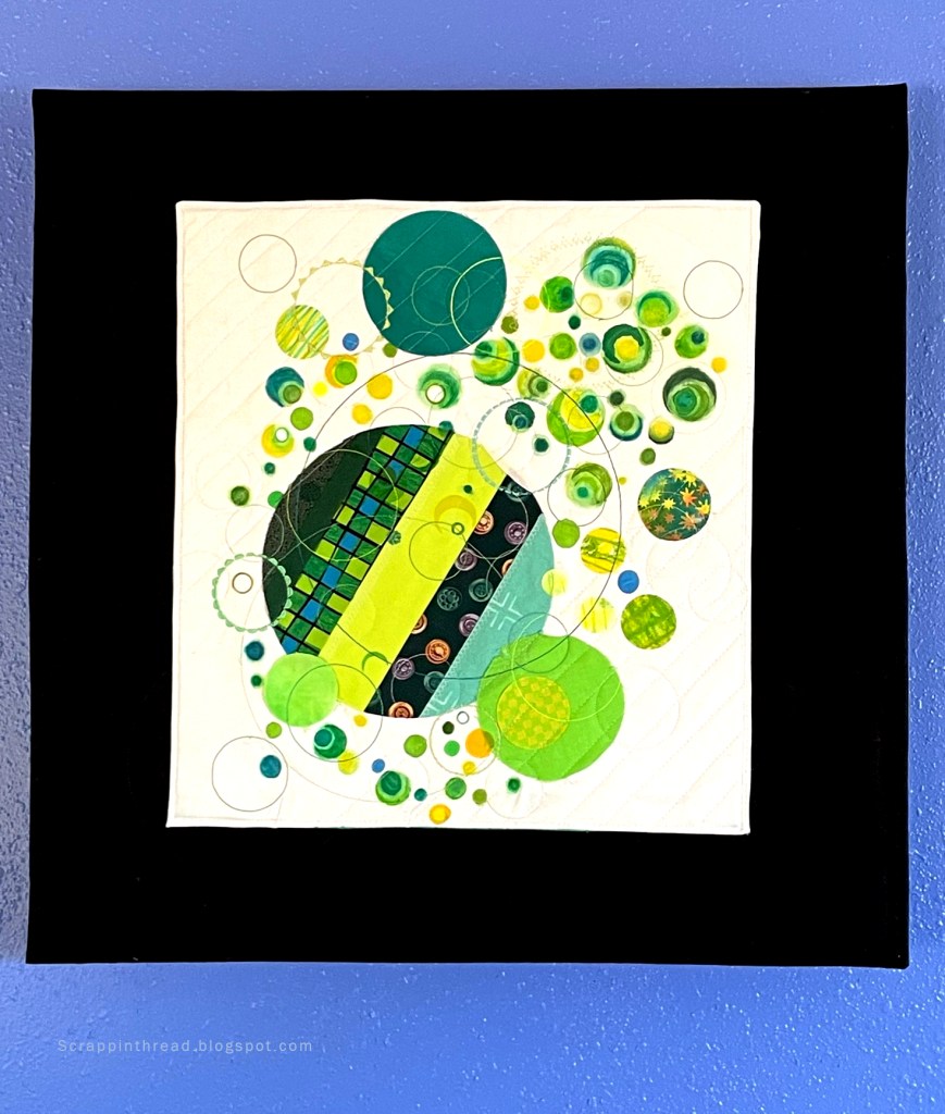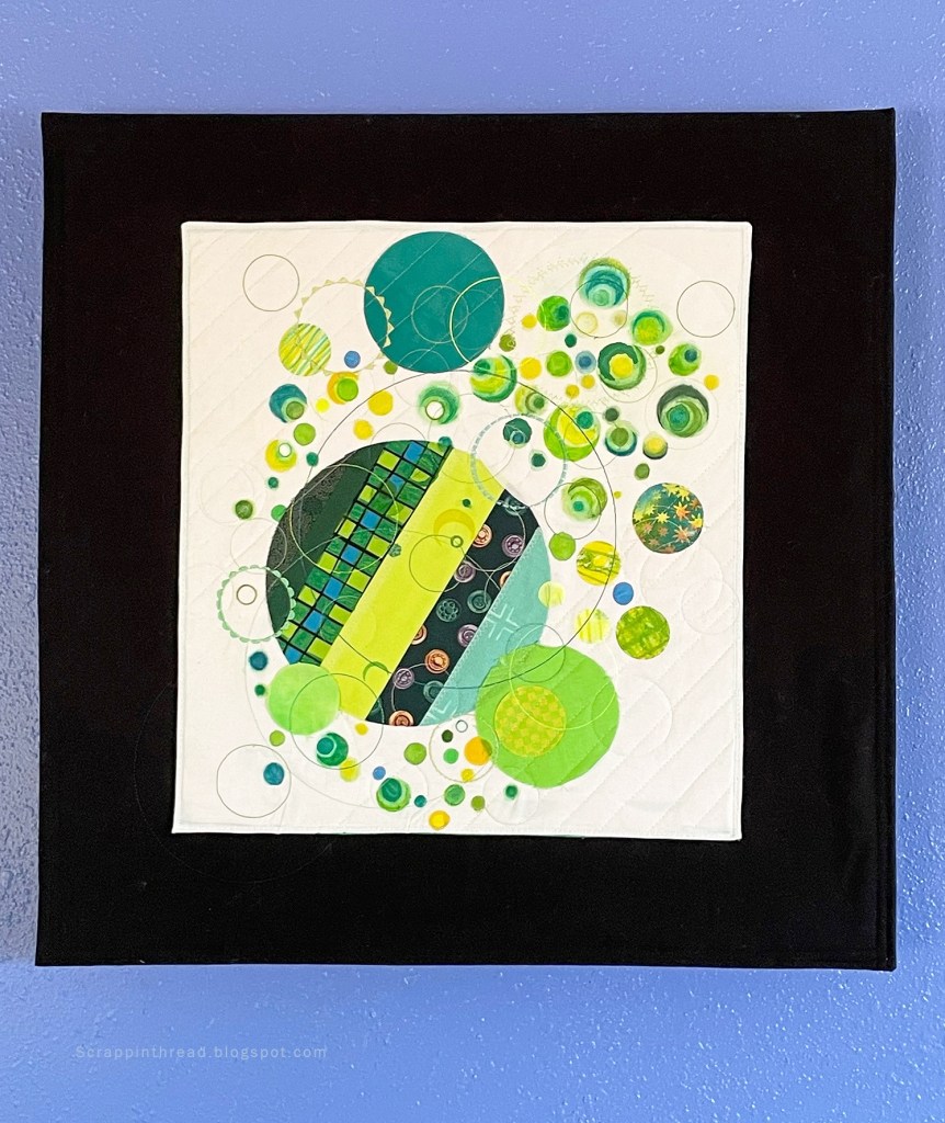 The busy little quilt needed to be mounted onto a solid background to give it some space. After auditioning a number of options, I decided to use a previously painted wood panel, measuring 24″ square. The sides are now painted black. I layered a piece of batting and black fabric together and quilted it enough to hold it together. The edges were turned prior to quilting. Then I attached the small art quilt to it and glued the entire thing onto the wooden frame.