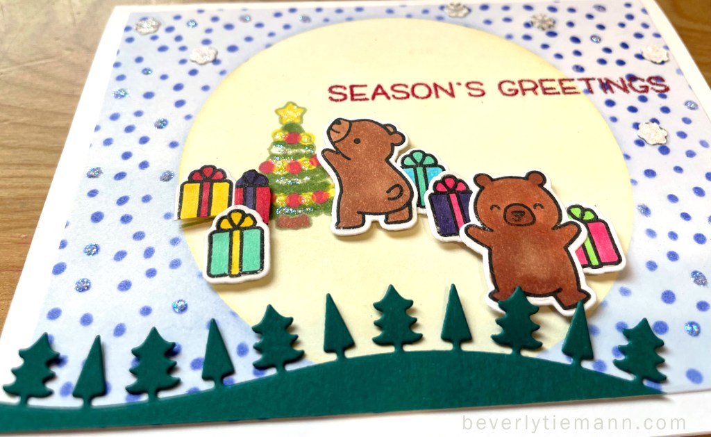 Every once in awhile, it is fun to switch things up and do something I hadn’t planned. This post is all about that serendipitous path to making a cute critters Christmas challenge card. The August challenge at Caffeinated Christmas Card Challenge is to use a cute critter. Lawn Fawn always comes to mind for cute images, so I dug into my stash to find stamps and dies. Here is the resulting cuteness.