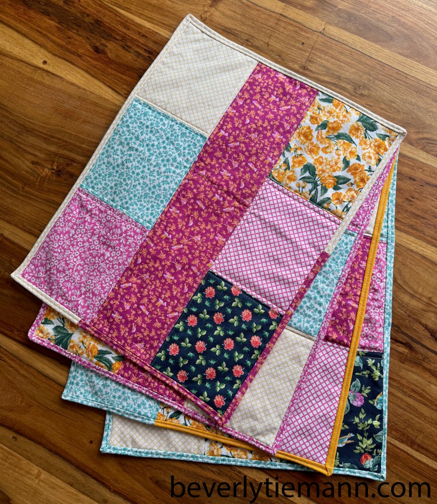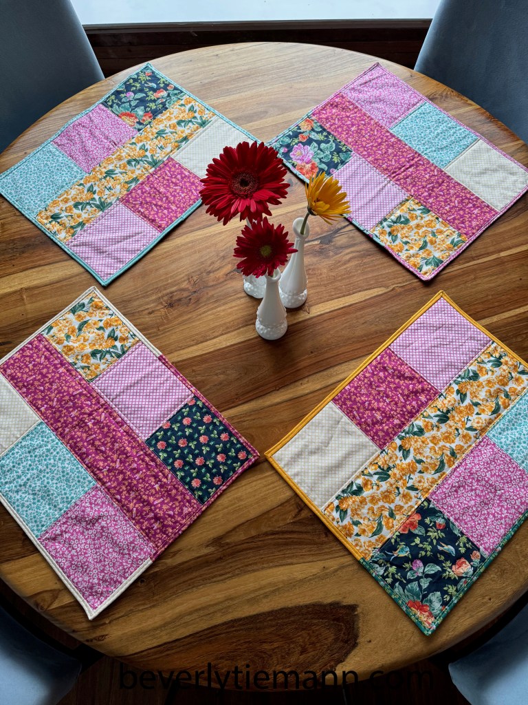 Thank you to Connecting Threads for sending me the lovely packet of Spring Nectar fat quarters. This is the last project I’ve made from the wonderful floral fabric. You can see a pojagi style curtain, potholders, and a rice-pouch bag in the posts immediately preceding this one which uses this fabric. The placemats are made from the scraps leftover from those projects. If you make a purchase after clicking through from this blog, it will not cost you anything additional but will pay me a small commission for my time and expenses. Thank you.