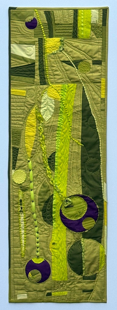 The picture above shows more detail. The quilt is made from wool, cotton, silk, linen, rug warp, beads, roving, yarn, and threads of varied weights. Some of which I dyed, and some of which others dyed. The commercially dyed fabrics make up the bulk of the quilt. There are also repurposed and recycled materials used. This piece includes tones, tints, shades, and the true color hue of chartreuse and red violet.